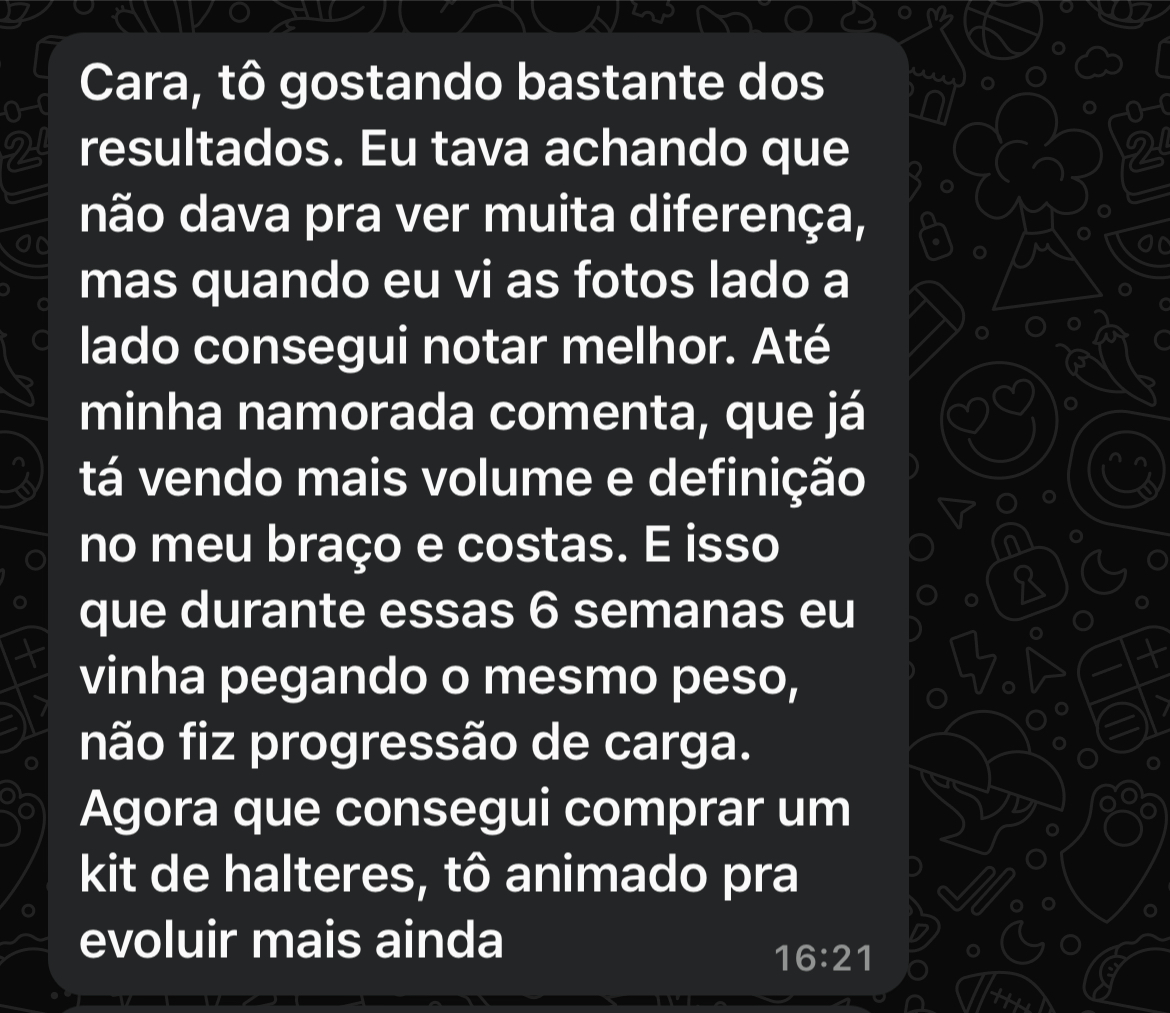 Você recebe seu treino e dieta individualizados por app, acompanha o progresso com o time de suporte e nutrição, e tem contato direto com o time pelo WhatsApp.