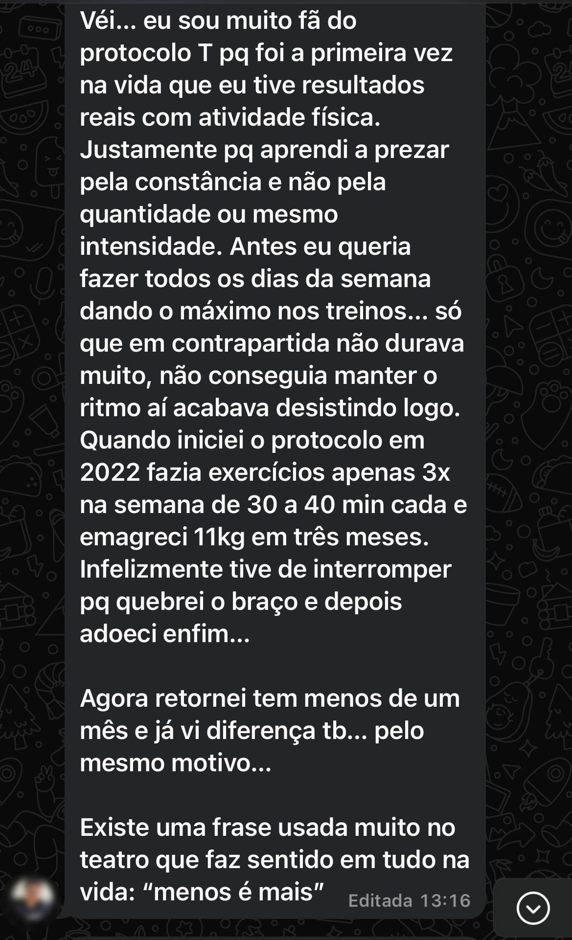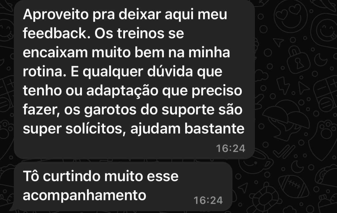 Suporte constante de uma equipe que te entende. Você não treina sozinho(e/a): nossa equipe te orienta, ajusta e acompanha sua jornada de perto, com contato frequente e personalizado.